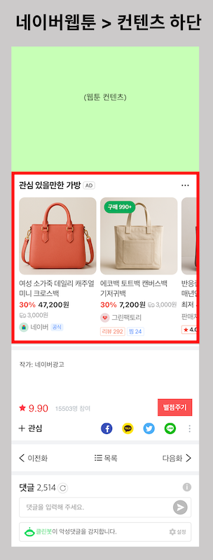 2025년 9월 29일(월)부터 네이버웹툰 모바일 지면에 '우측 스크롤 형태'의 쇼핑 추천 광고 상품이 노출될 수 있습니다.
